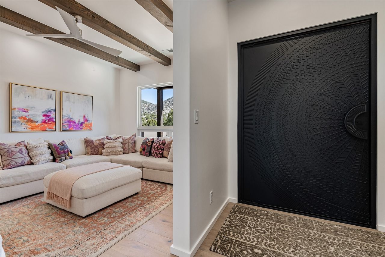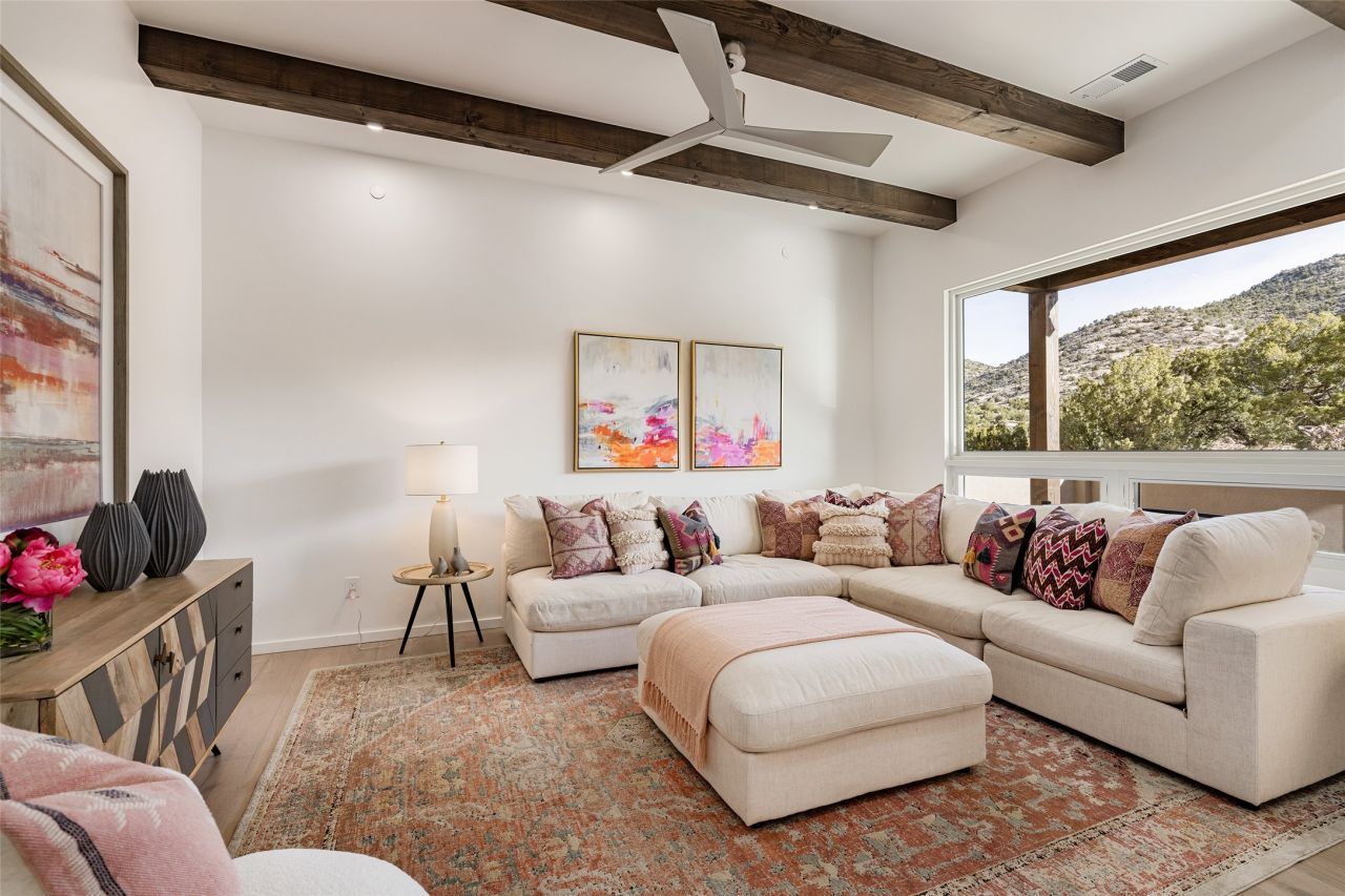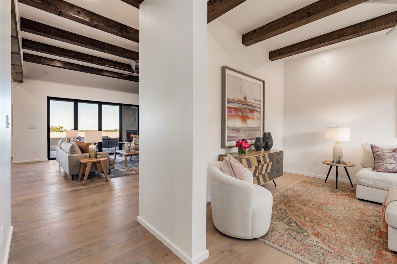 Set on 2.6 acres with sweeping desert and mountain views, this beautifully crafted 2,794-square-foot new home blends clean modern design with timeless Santa Fe style in the sought-after Longview community. Recently completed, the home offers 3 bedrooms, 3.5 baths, a dedicated office, media room, and spacious 3-car garage, thoughtfully designed for both comfort and functionality. Warm natural materials, wood beams, wood floors, and contemporary finishes reflect Santa Fe's unique architectural heritage. The open-concept floor plan features light-filled living spaces, a chef's kitchen with ZLINE appliances, and a butler's pantry, creating an ideal setting for everyday living and entertaining with seamless indoor-outdoor flow. The private primary suite offers a spa-inspired bath and direct access to outdoor living areas that capture the beauty and tranquility of the surrounding high desert landscape. This recently completed custom home presents an exceptional opportunity to own a brand-new residence with expansive views in one of Santa Fe's most desirable high desert communities.