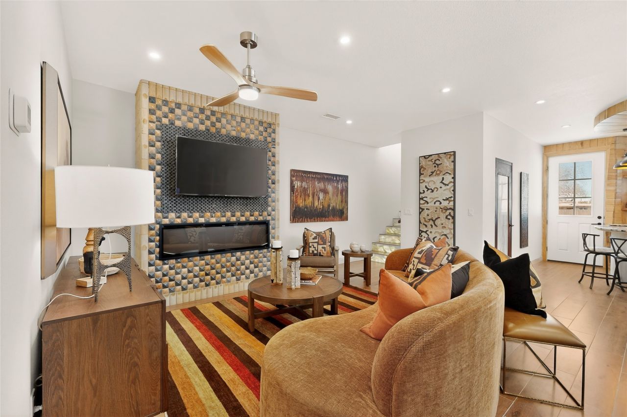 Old world craftsmanship blends seamlessly with modern luxury at the Estancia Collection, a unique compound located in the Baca Railyard District, minutes away from Santa Fe's top galleries and restaurants. This latest vision of renowned developer Mitch Menaker, is where every room becomes a work of living art. Curated by artisans from around the world, using hand cut semi-precious stone, tiles, iron, and rare wood finishes creates a truly immersive and peaceful experience, as if being hugged by nature. As you walk through the sanctuary, a warm greeting by a hand painted dancing Kachina panel inspiring abundance, health and balance meets you. Inside are hand carved teak doors, kitchen cabinets and ceiling treatments, along with petrified wood countertops. The stunning fireplace is crafted with hand cut sandstone in a bamboo pattern. The main level office/bedroom features antique stained glass doors opening to the ensuite bathroom's pink jasper stone sink and mirror sitting atop a beautiful hand carved teak vanity. A magical backlit white onyx staircase creates a dreamlike effect as you ascend to the bedroom suites above. The primary bedroom greets you through a charming speak easy door and a whimsical teak puzzle floor creates a sophisticated, yet playful tone. This light-filled sanctuary features a fireplace, wet bar and a one of a kind spa-like bathroom. The sinks, mirrors and bathtub are made of semi-precious tigers' eyes and the shower is made of back-lit onyx panels, creating a luxurious and luminous retreat. The second light-filled bedroom features a private balcony and bath with hand carved vanity and a mother of pearl stone sink and backsplash. The laundry room, located on the 2nd floor includes a dog shower covered with 'happy dog faces on each hand cut tile. Blending ancient techniques with the expert hands that brought them to life, the developer's vision has created the most unique visual and artistic sanctuary Santa Fe has seen in years.